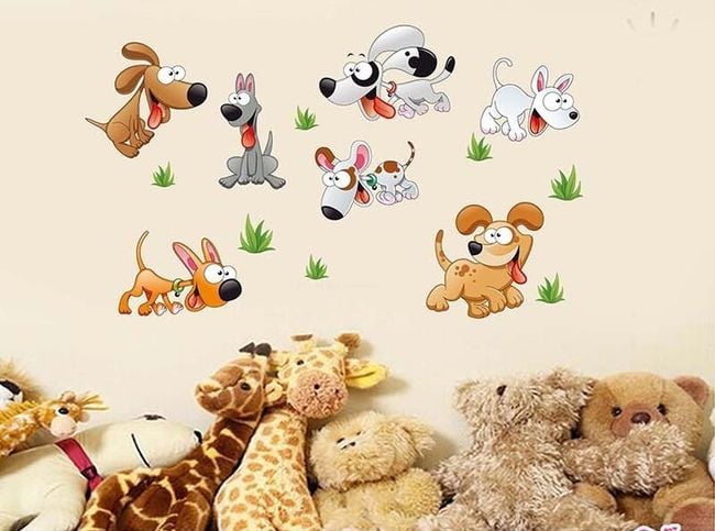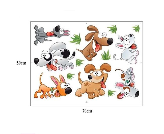 Decorate your child's room with original stickers featuring cheerful dogs. They are enjoying life and smiling at the world. The sheet includes seven different dogs and small tufts of grass. You can apply the individual sticker pieces to the wall according to your own imagination.