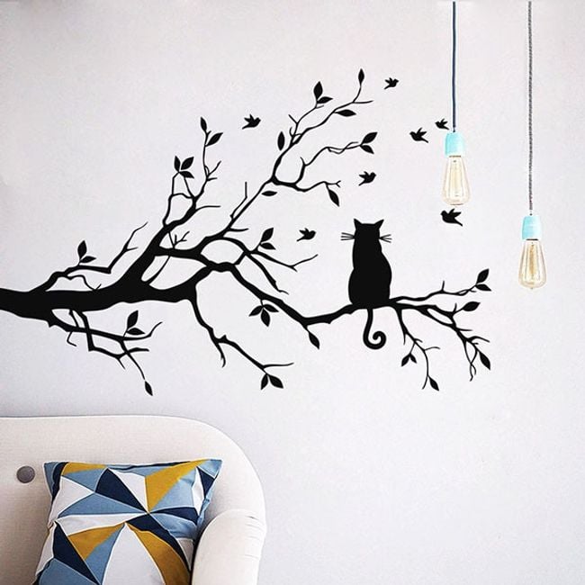 Do you like cats? Get this stylish wall sticker featuring a kitten on a tree branch. The sticker is perfect for the living room, bedroom, or office. It will easily and quickly brighten up the entire room. The sticker also includes small birds that the kitten is watching.
