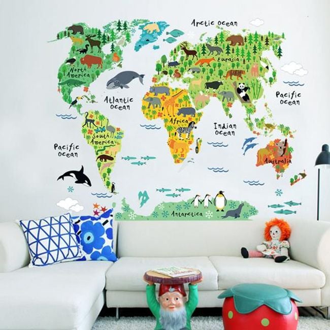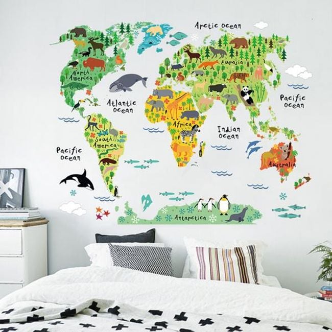 An imaginative sticker that is both cheerful and educational, making it perfect for a child's room. The sticker features a world map with animals, so children will have an overview of where different animals live. The sticker can be applied to all smooth surfaces such as walls, doors, windows, etc.