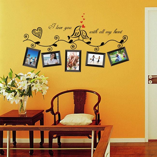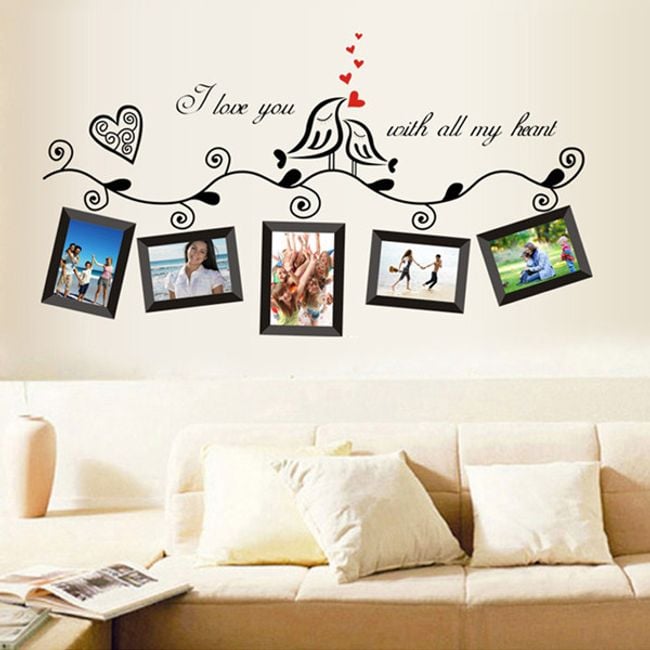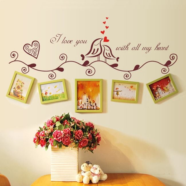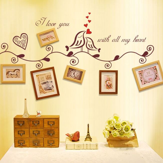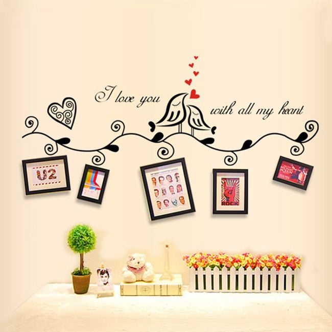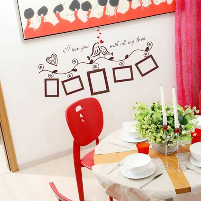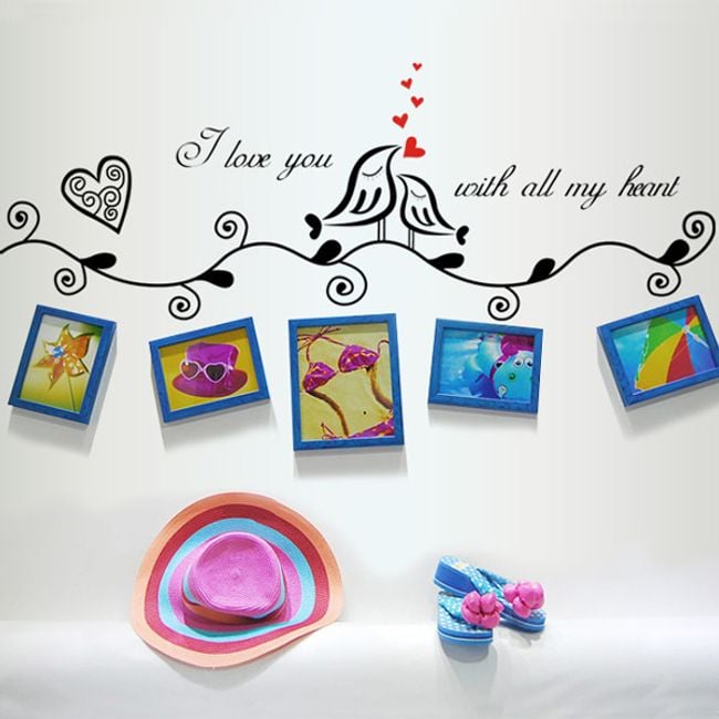 Decorate your home with a beautiful wall sticker featuring a loving pair of birds. The package includes five adhesive frames where you can insert your favourite family or nature photos. The inscription “I love you with all my heart” makes the sticker very romantic. Before applying the wall sticker, ensure that the surface is smooth enough for the sticker to adhere well.