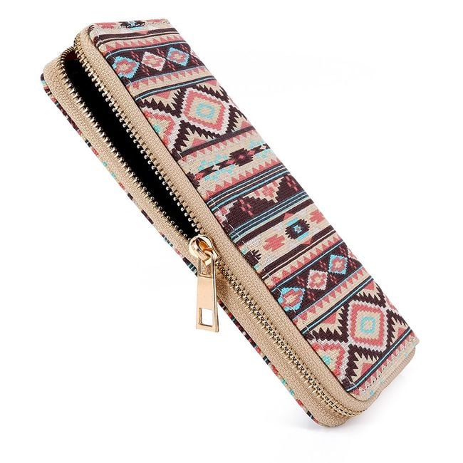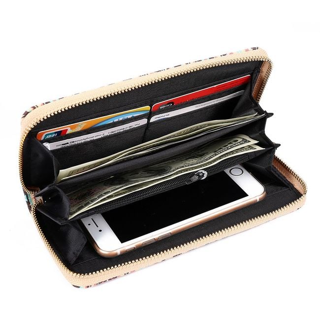 The wallet features a secure zip fastening, so nothing can fall out. Inside, there are approximately eight card slots, a compartment for banknotes, coins, and it can also fit a phone.