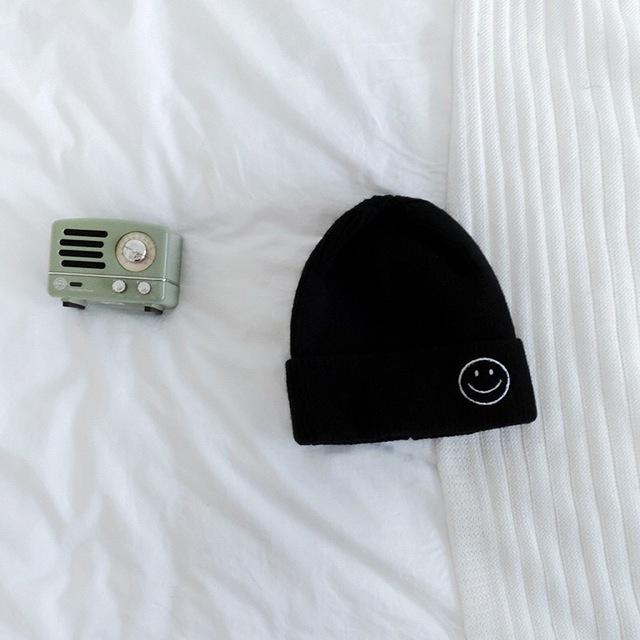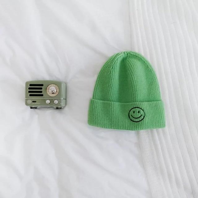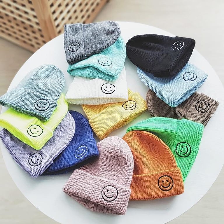 Children's beanie made of elastic knit in various colour options. The hem features an embroidered smiley face.