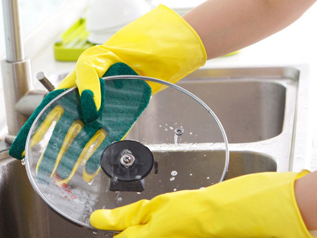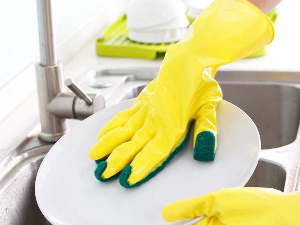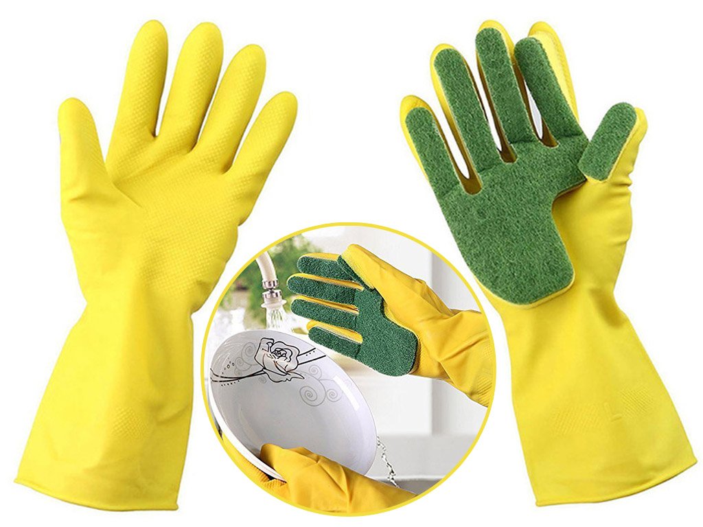 Do you have sensitive skin and do cleaning products irritate your hands when washing dishes? One of the rubber gloves has a scrubbing sponge permanently attached to the palm. It protects your hands from water, cleaning products, and dirt.
