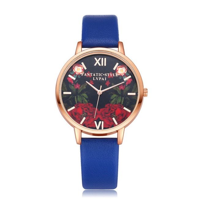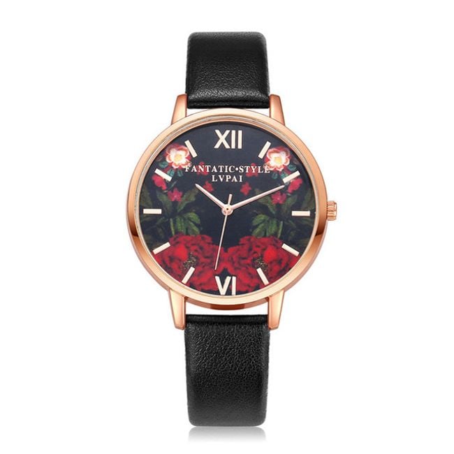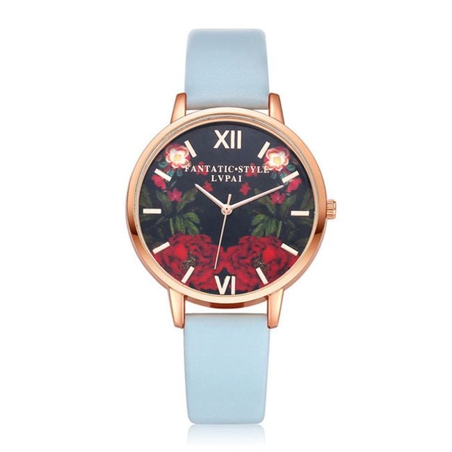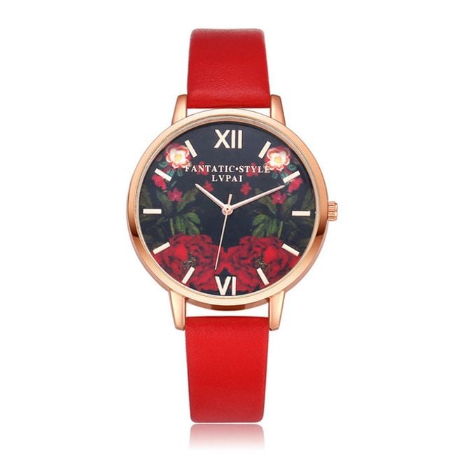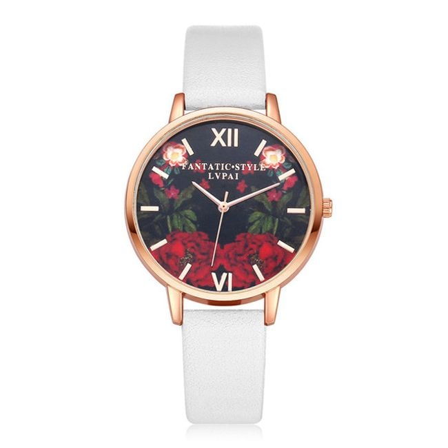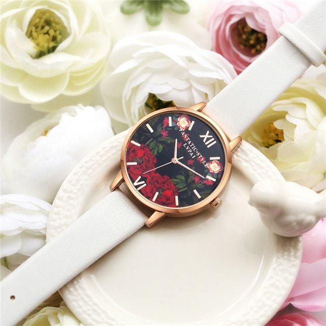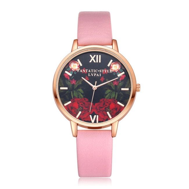 The watch with a coloured strap features a dial adorned with romantic flowers.