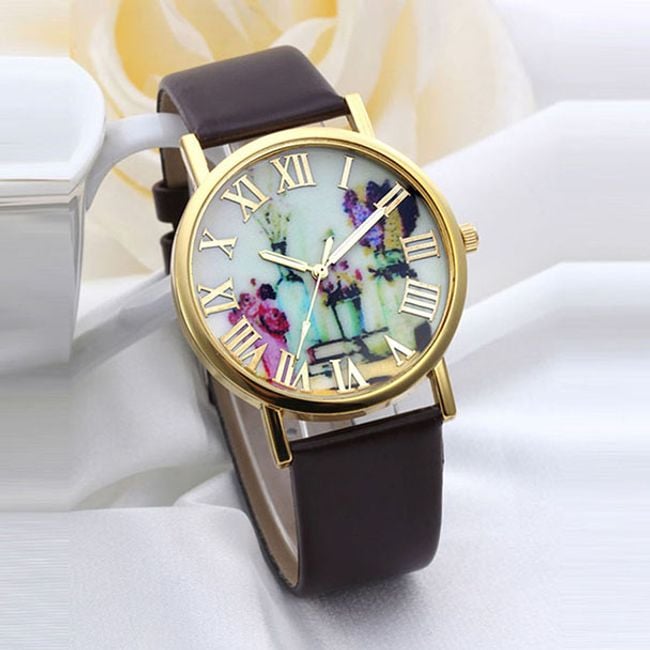 Women's watch with Roman numerals and a floral design.
