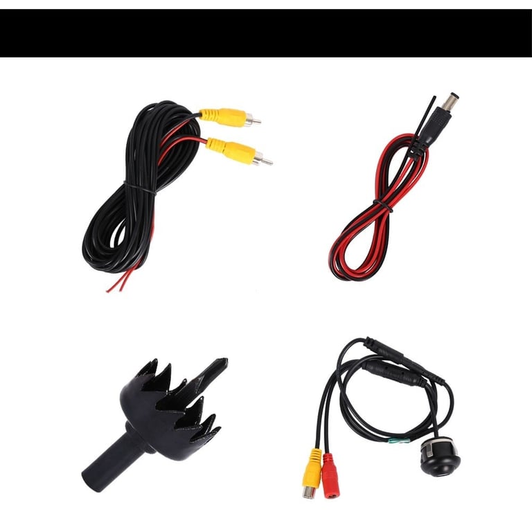 Package Contents: 1x camera, 1x power cable, 1x video cable, 1x user manual, 1x drill