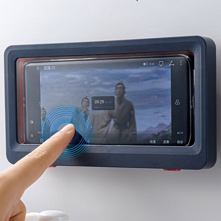 Waterproof phone case. Can be installed on mirrors, bathroom tiles, in the kitchen, etc. The case is fog-resistant. The touch screen works through the case.