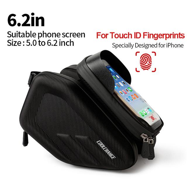 Waterproof mobile phone holder for bicycles with side pockets. Specially modified for iPhone – the phone can be unlocked with a fingerprint.
