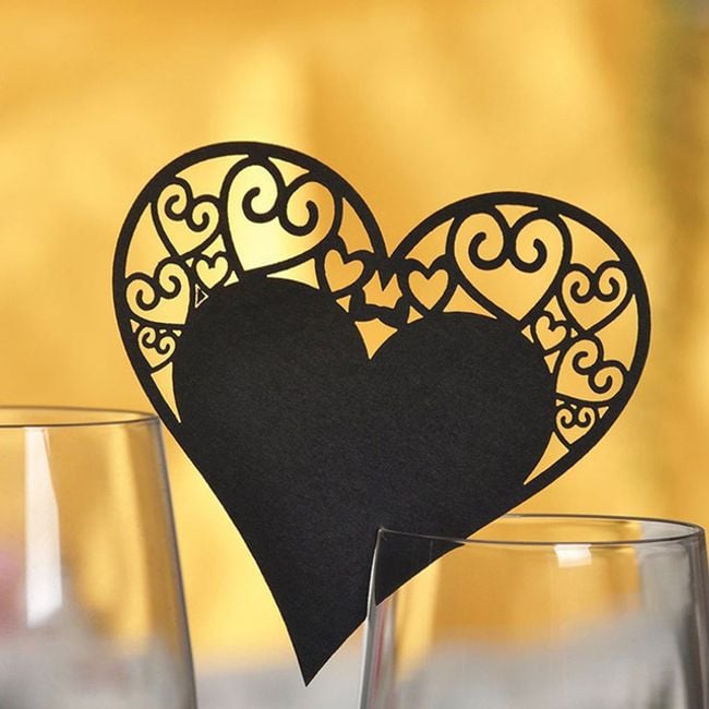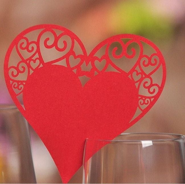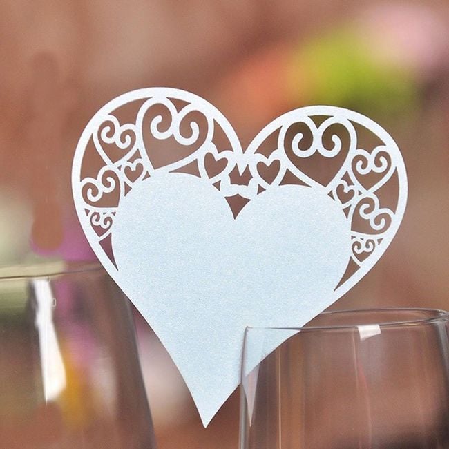 Heart-shaped name tags will adorn the glasses at the wedding reception. This original decoration will also help show guests where their place is at the table.