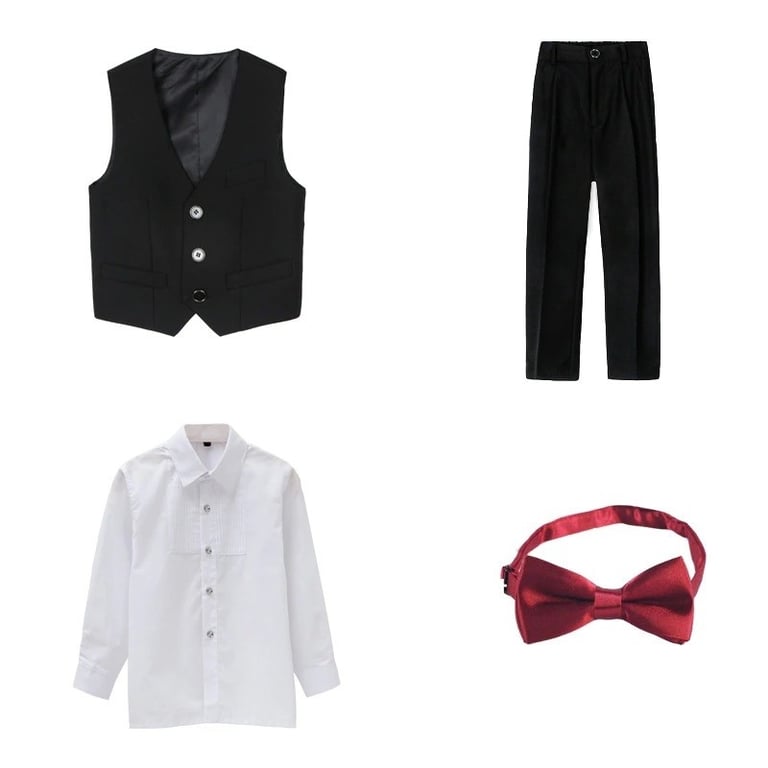 Package contents: 1x waistcoat, 1x shirt, 1x trousers, 1x bow tie