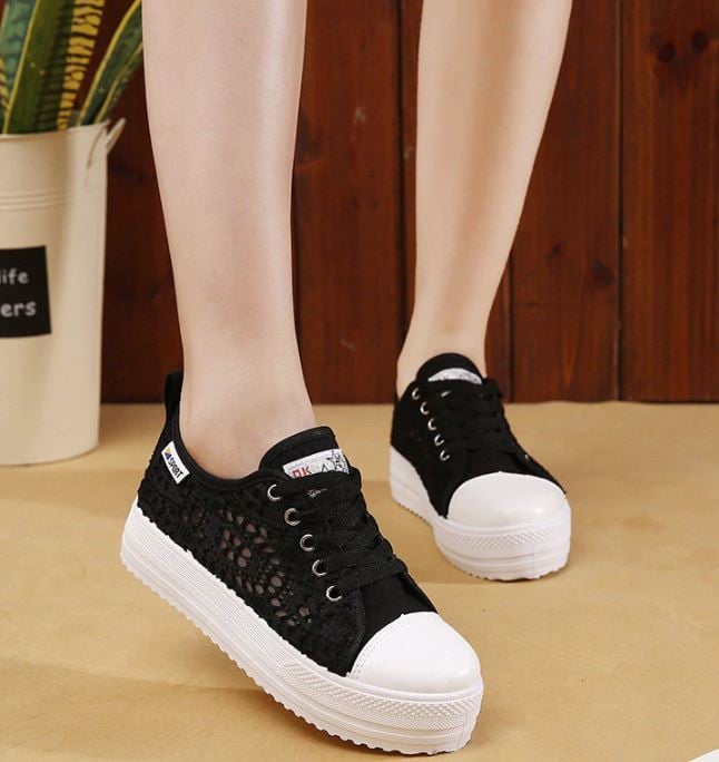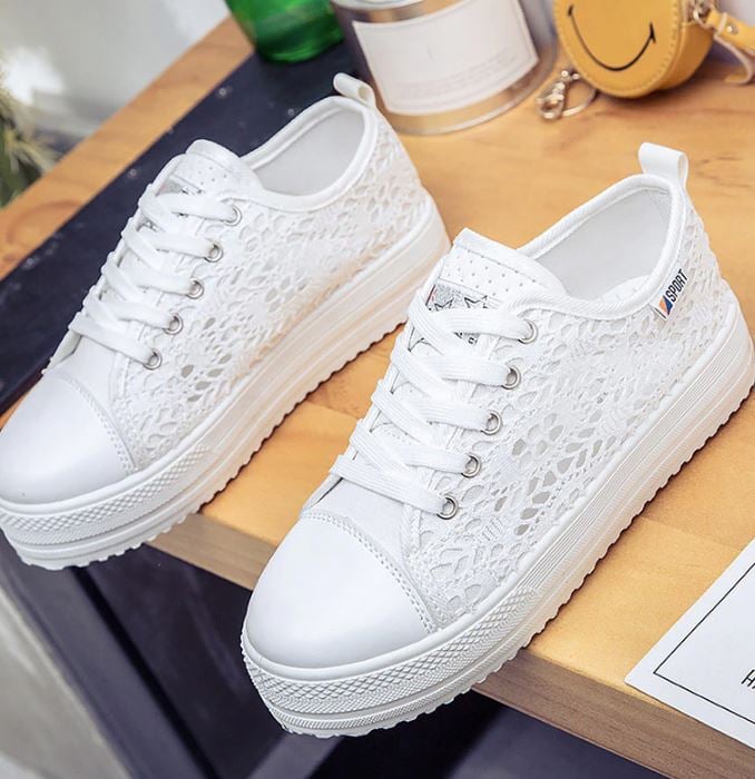 White elevated women's canvas trainers with mesh.
