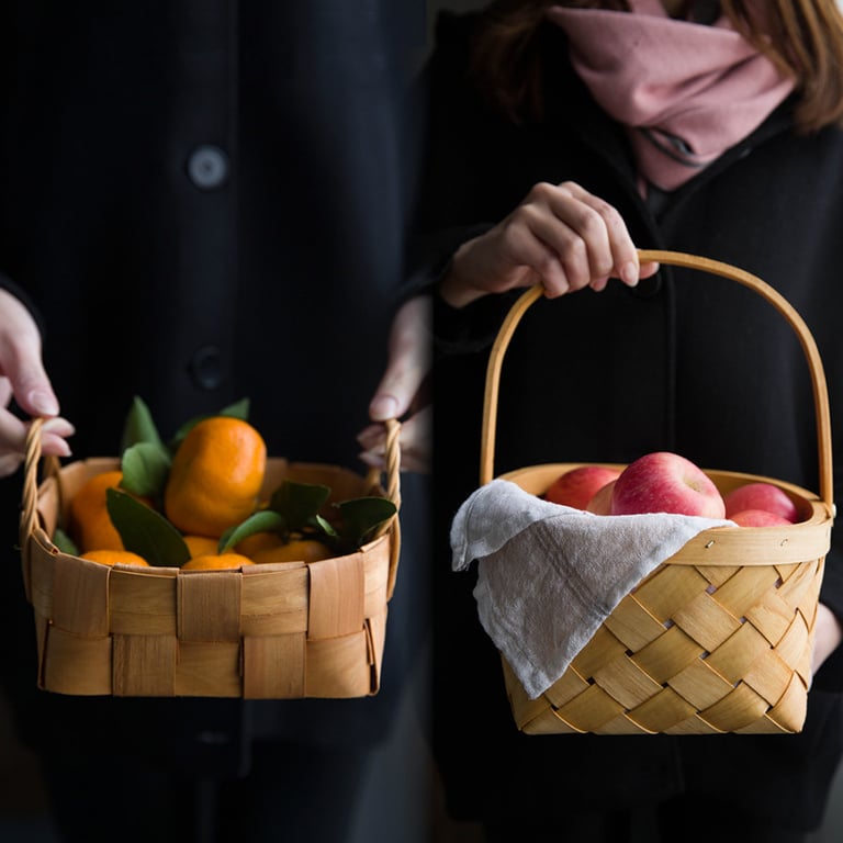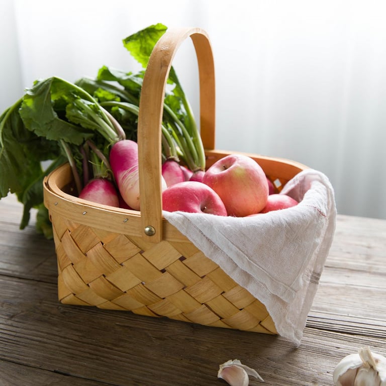 Wicker bamboo basket with a handle. Suitable for picnics, food storage, or just as a decoration. Available in two sizes or as a set of two baskets.