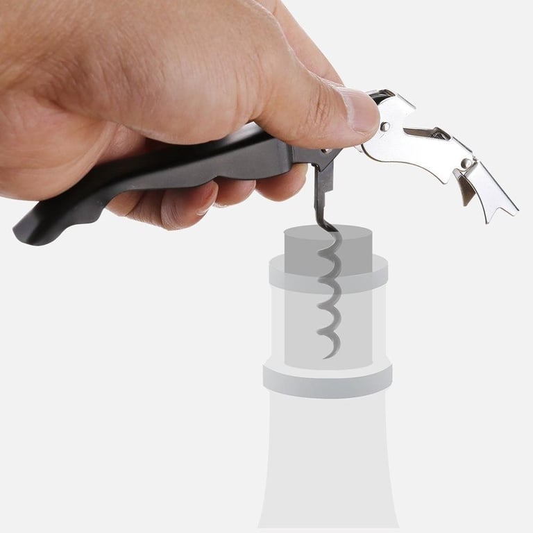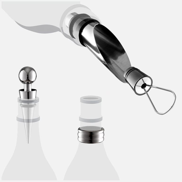 Includes a corkscrew, a bottle opener, a bottle neck ring, a stopper, and a pourer.