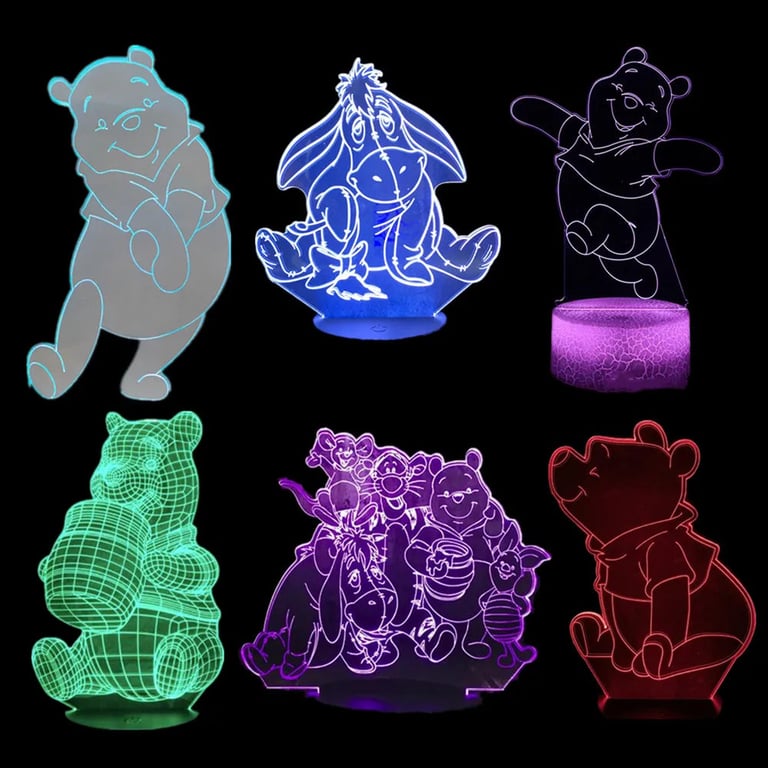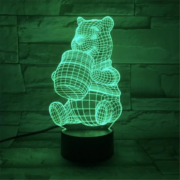 LED night light featuring Winnie the Pooh is an original decoration for children and fans of fairy tales. The engraved acrylic panel in the shape of Winnie the Pooh with honey creates a 3D lighting effect in various colour modes, which are controlled by remote control or touch. Energy-saving LEDs and USB power ensure convenient use at home and in a child's bedroom.