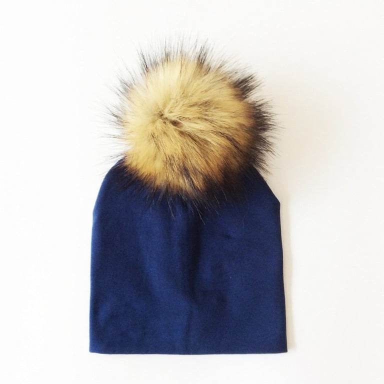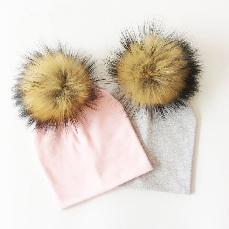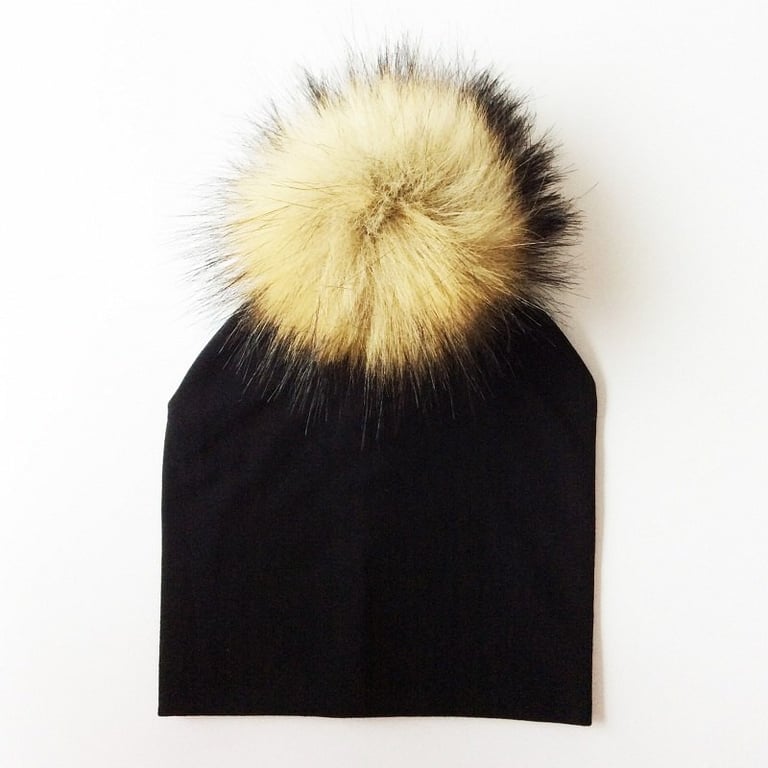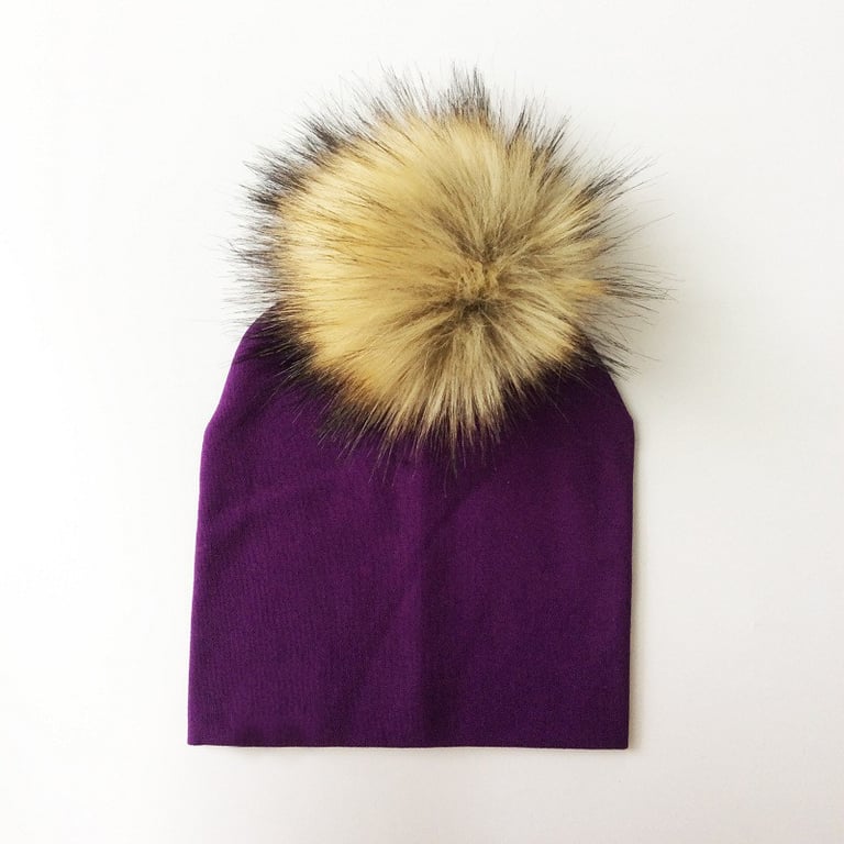 Children's solid colour cotton hat with a large fluffy pom-pom.