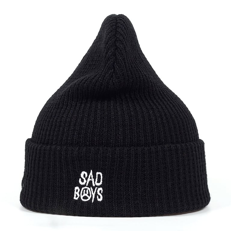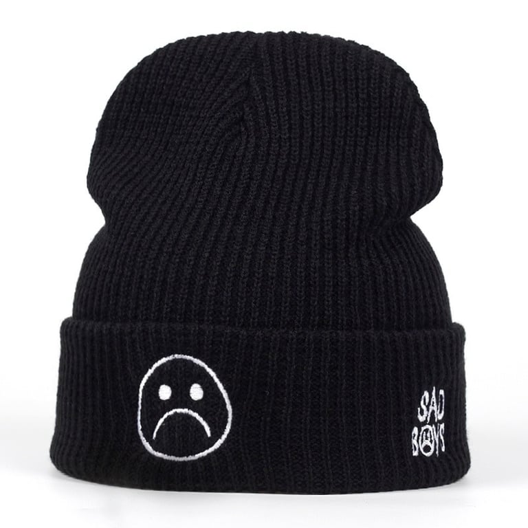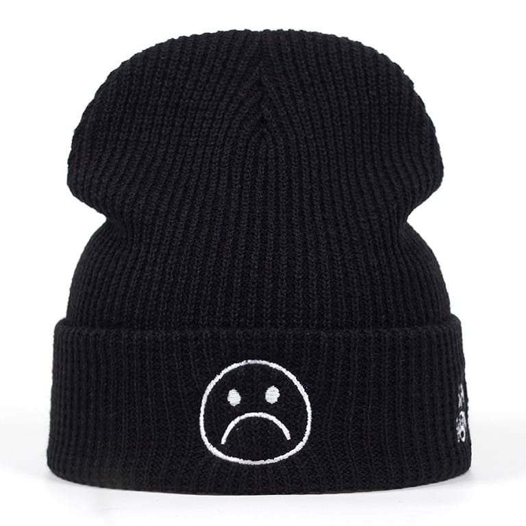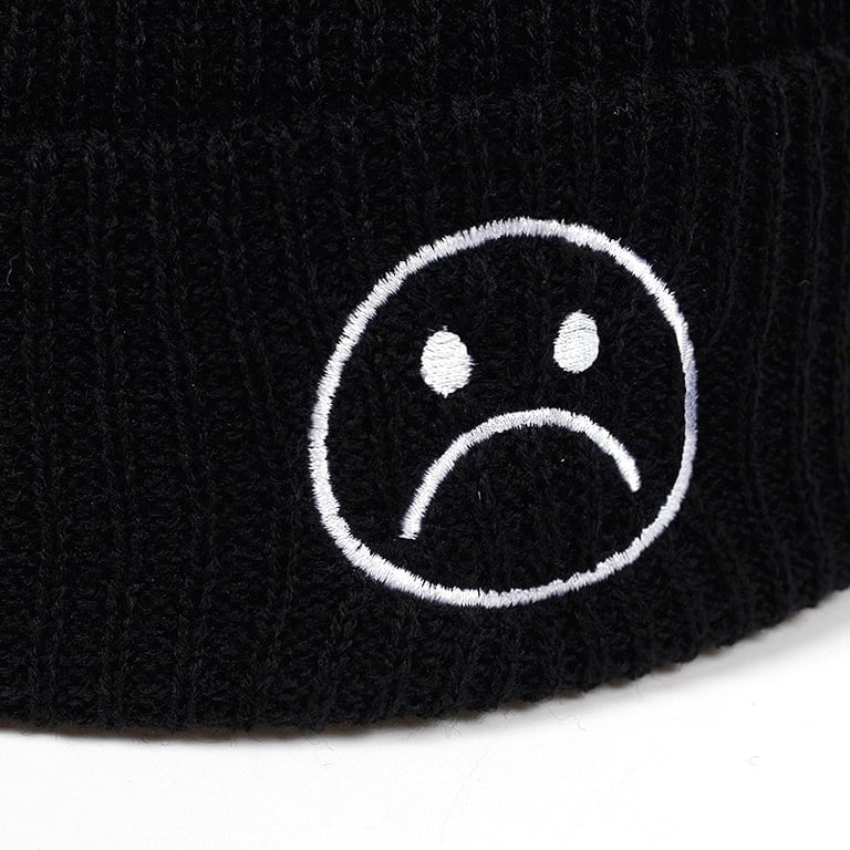 Classic black hat adorned with a frowning smiley face.