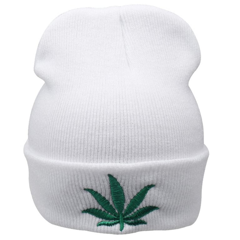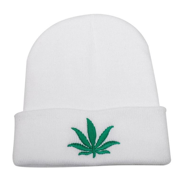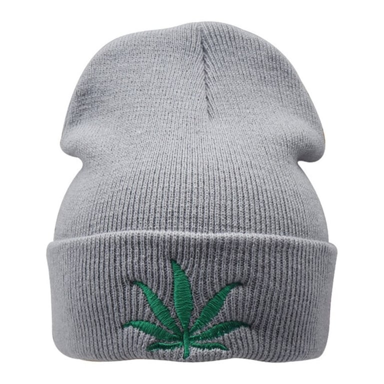 Funny winter hat with a green leaf on the front.