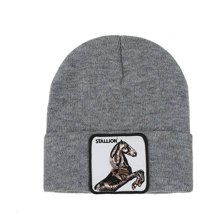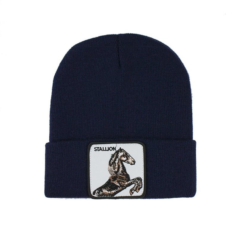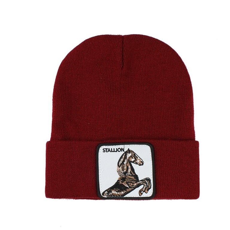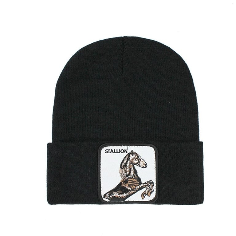Solid colour winter hat with a horse print.