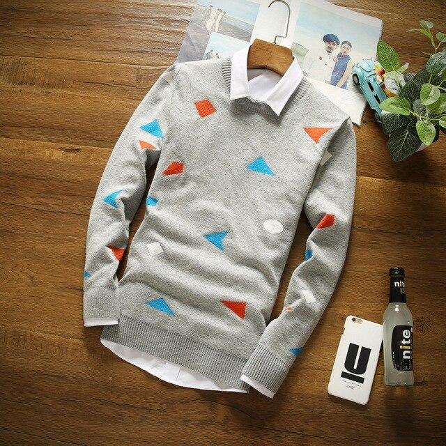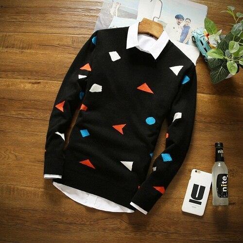 Woollen sweater with colourful geometric shapes. The jumper is available in several sizes.