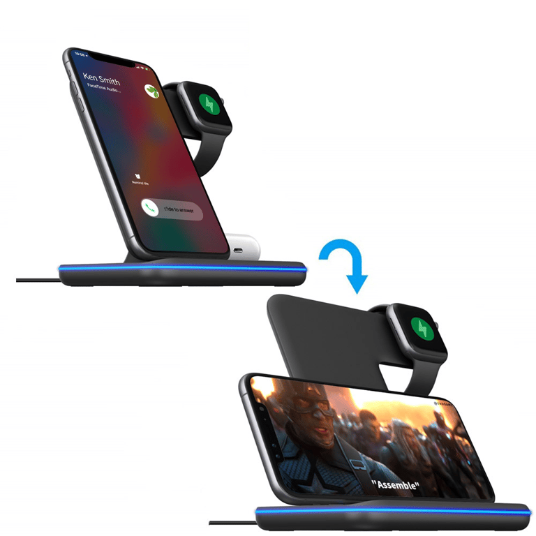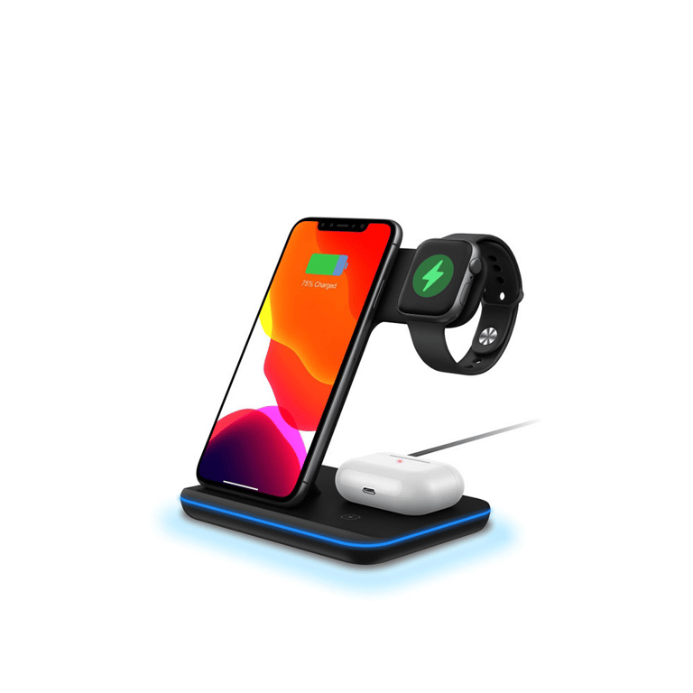 • Wireless charger for iPhone, watch, and headphones 3-in-1 charges up to 3 devices simultaneously.