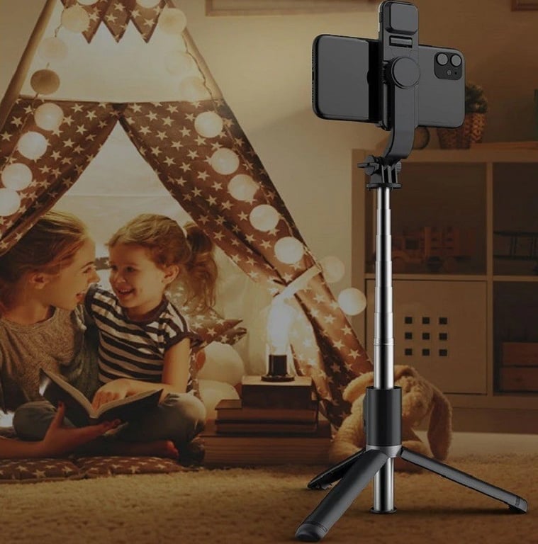 Easily foldable for convenient transport. The tripod includes a light for higher quality images. Compatible with mobile phones running iOS and Android. Additionally, it features a remote control shutter with a range of up to 10 metres.