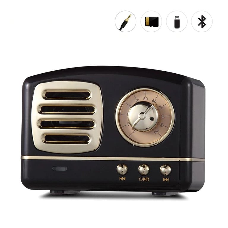 Wireless speaker in retro style for every home. You can play your favourite song from your phone via Bluetooth, or you can use the radio and audio input.