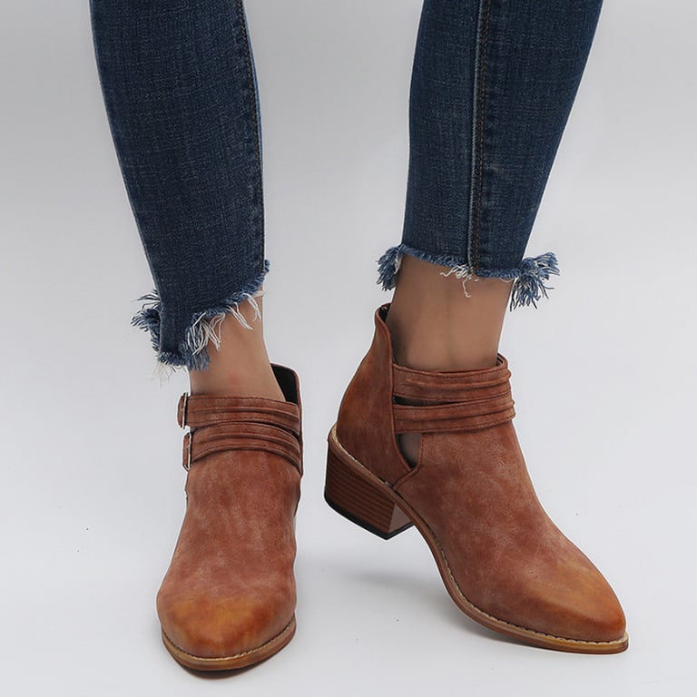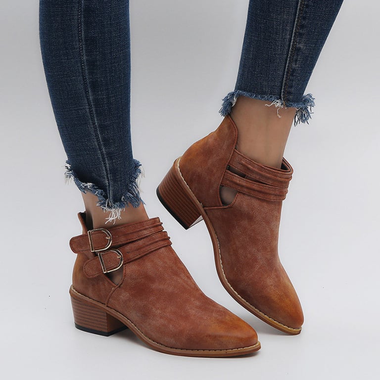 Women's ankle boots with decorative buckles. Pointed toe and low wide heel. Synthetic leather. Available in multiple colours.