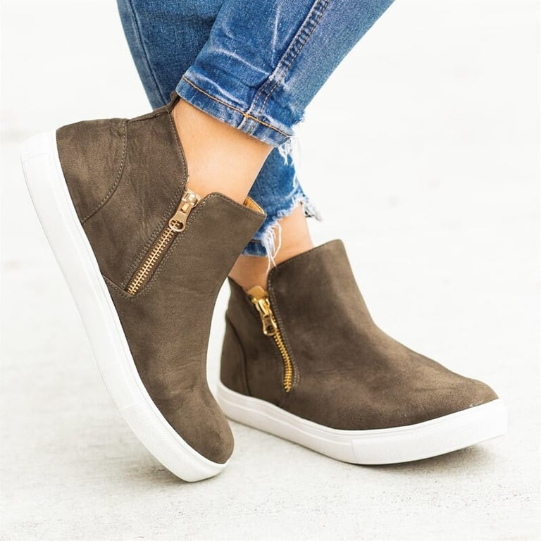 Women's ankle boots with a leather-like appearance. Flat rubber sole. Zip fastening on both the inner and outer sides. Available in multiple colour options.