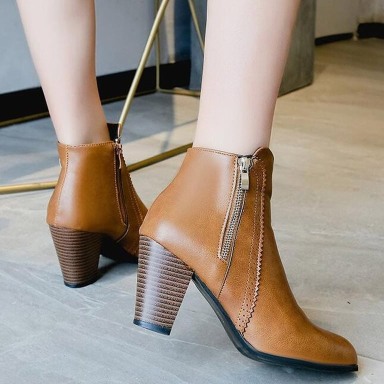Women's ankle boots with a heel. The shoes have a flat sole and a side zip fastening. Leather look. Available in multiple colour options.