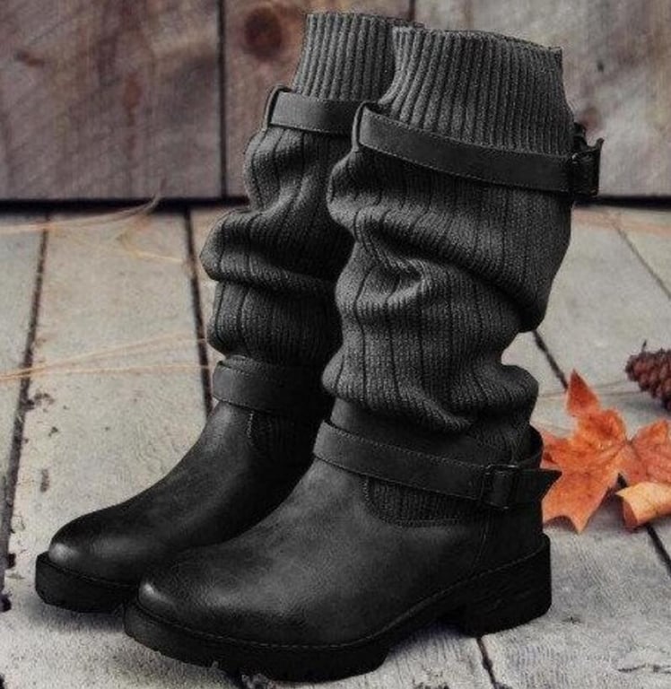 Women's winter high boots with an elastic knitted cuff. The boots have a low heel and buckles on the outer sides. Available in three colours – black, grey, brown.