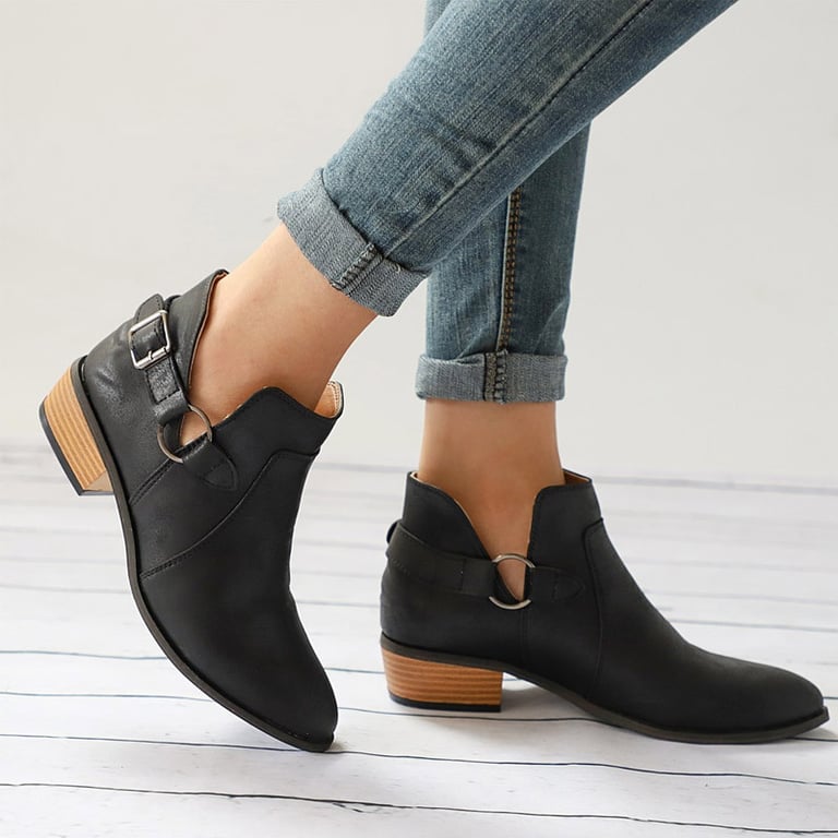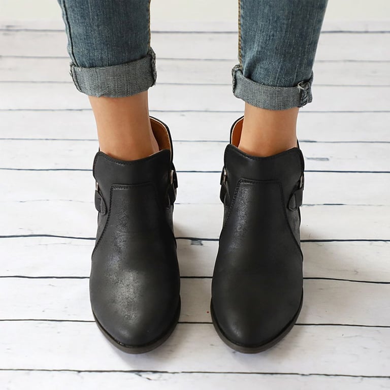 Women's ankle boots with a heel. The shoes have a leather-like appearance and are adorned with buckles on the sides. Available in two colour options.