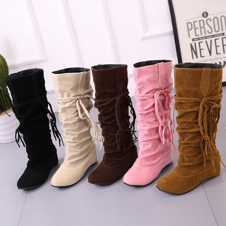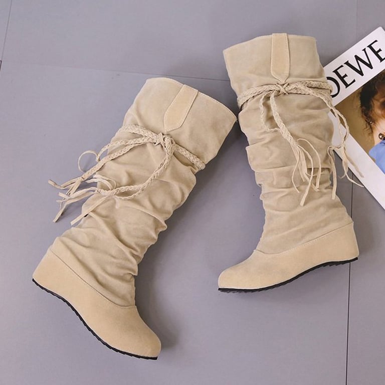 Women's knee-high winter boots. The boots have a suede appearance and are adorned with knitted laces at the top. Available in several colour options.