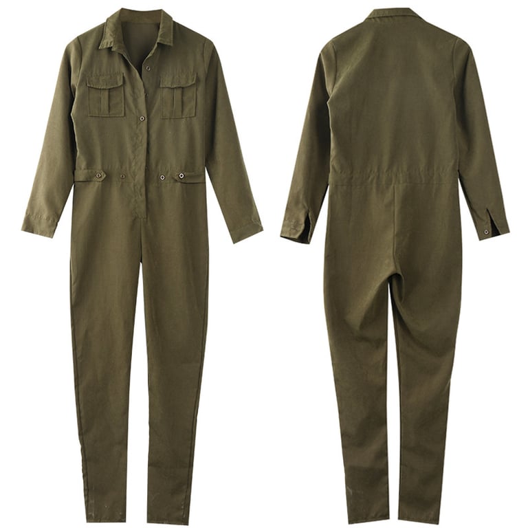 Trendy jumpsuit with long sleeves in army style. Green colour, button fastening.