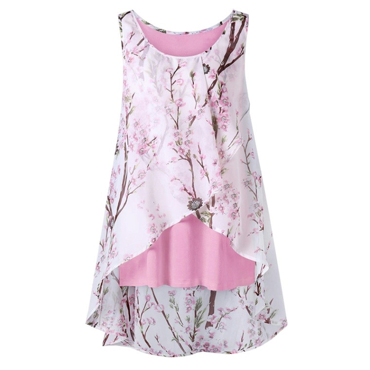 Women's sleeveless blouse with wide straps and a round neckline. Integrated underlayer. Asymmetrical loose fit. Colourful floral print. Plus size available. Multiple variants to choose from.