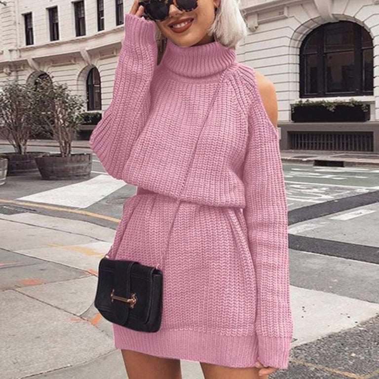 Women's short dress for cooler weather with a turtleneck and long sleeves.