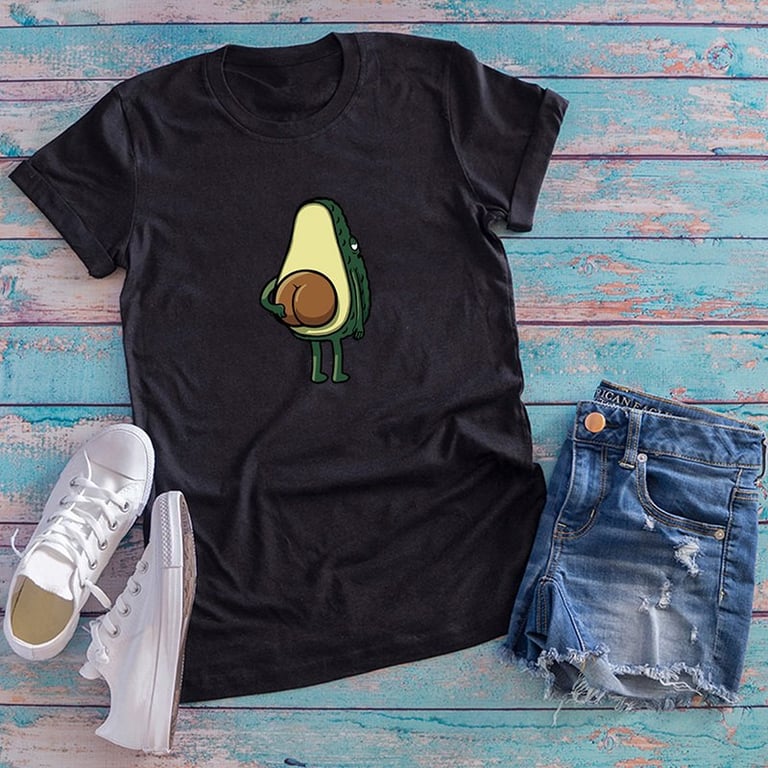 Women's t-shirt with an original print of an exposed avocado. The t-shirt features a round neckline, short sleeves, and a loose straight cut. Available in plus sizes and various colour options.