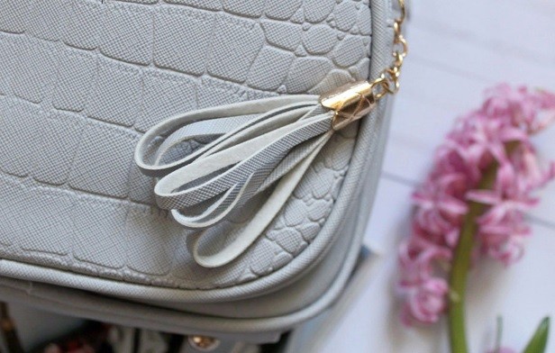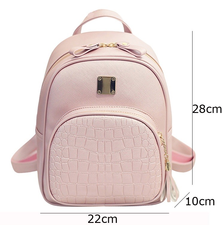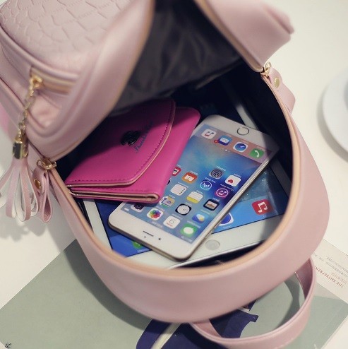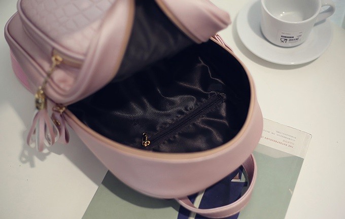 The front pocket of the backpack has an embossed pattern with a zip and faux fringes.
