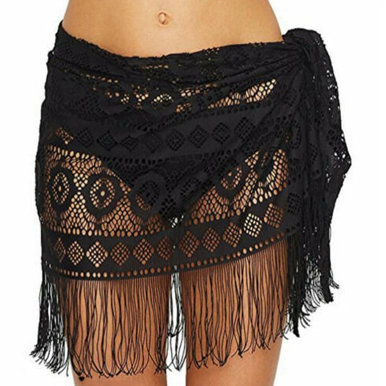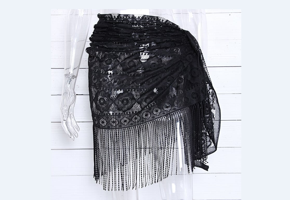 • Wrap-around design of a sexy sheer skirt with fringes.