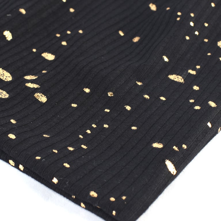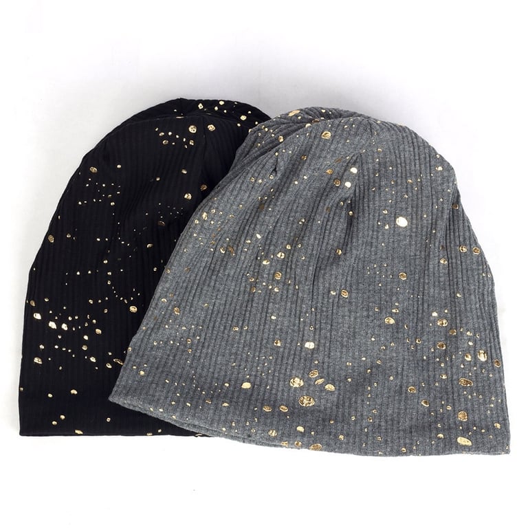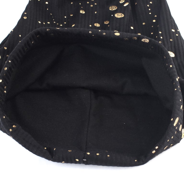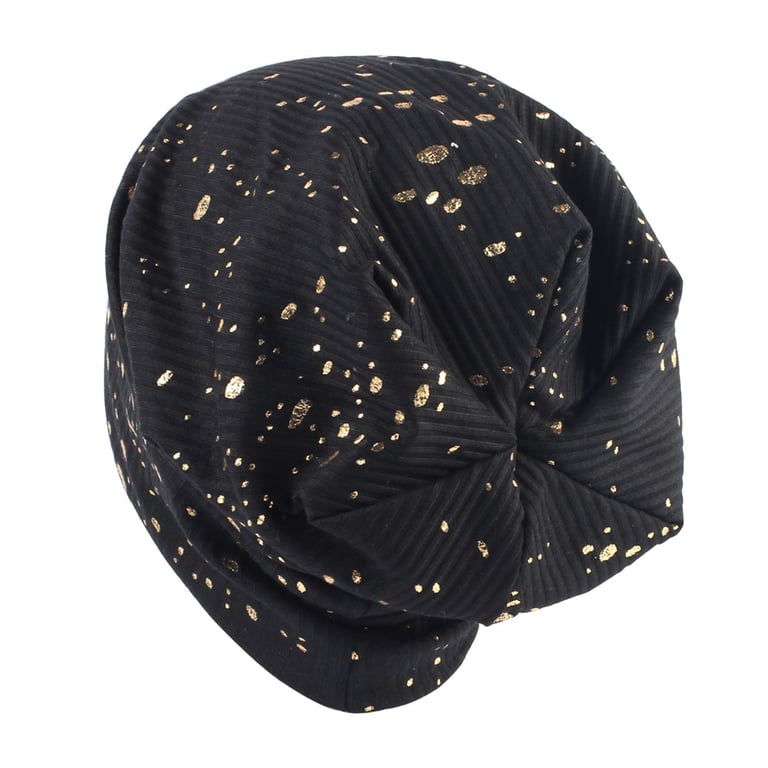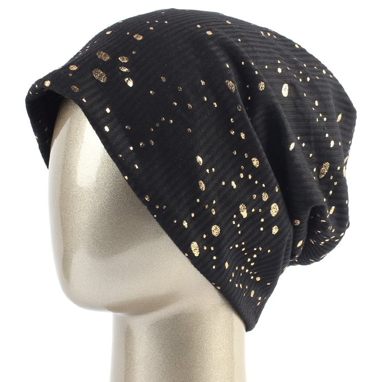 Modern women's beanie hat with golden droplets.