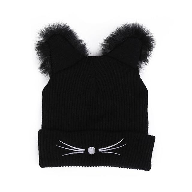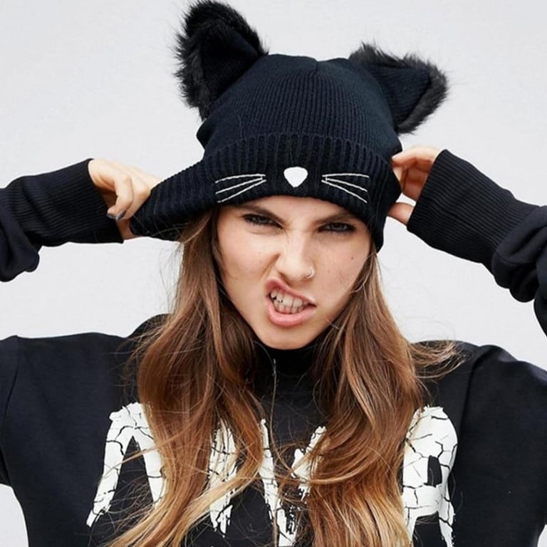 Elegant and stylish women's beanie with a print of little moustaches and fluffy cat ears. A truly original piece!