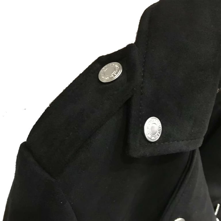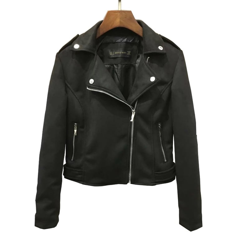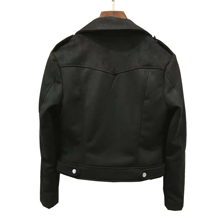 Women's faux leather biker jacket with a suede look. Asymmetrical zip fastening and collar with lapels. Two side zip pockets. Available in several colours.