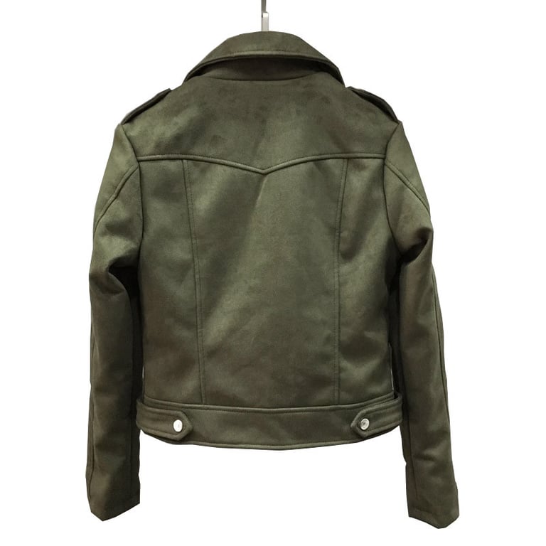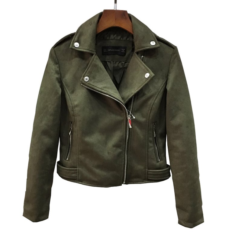 Women's faux leather biker jacket with a suede look. Asymmetrical zip fastening and lapel collar. Two side zip pockets. Available in several colours.