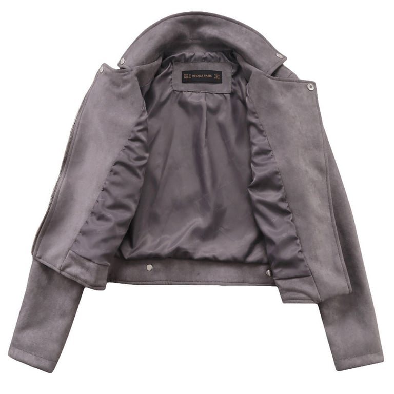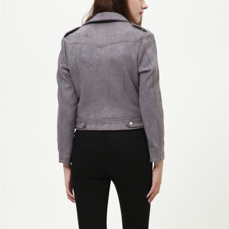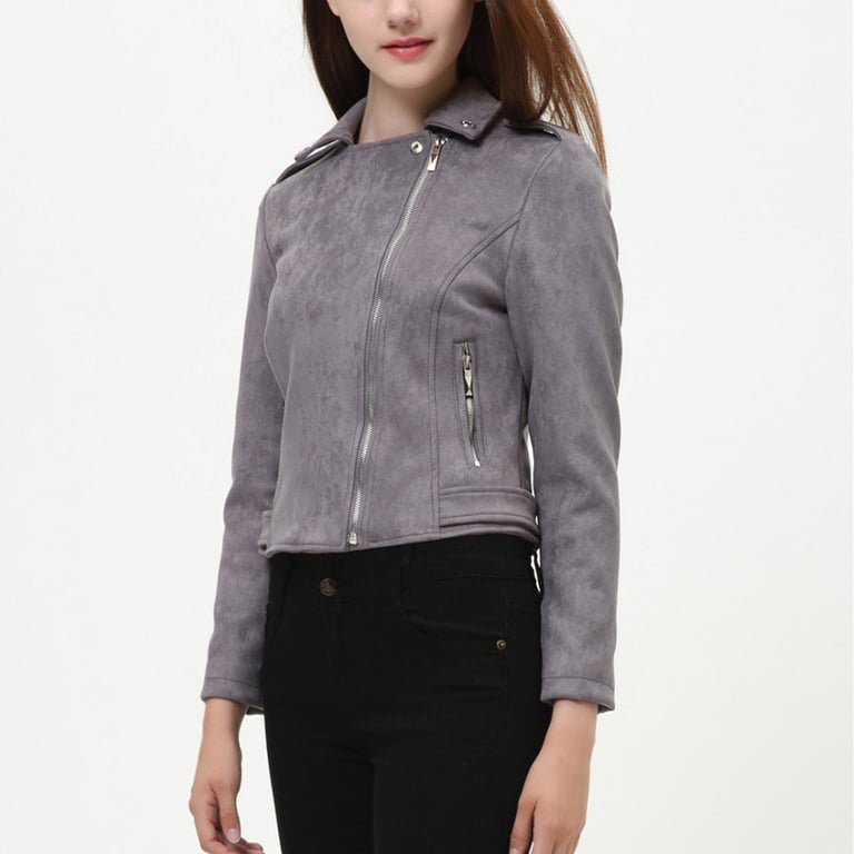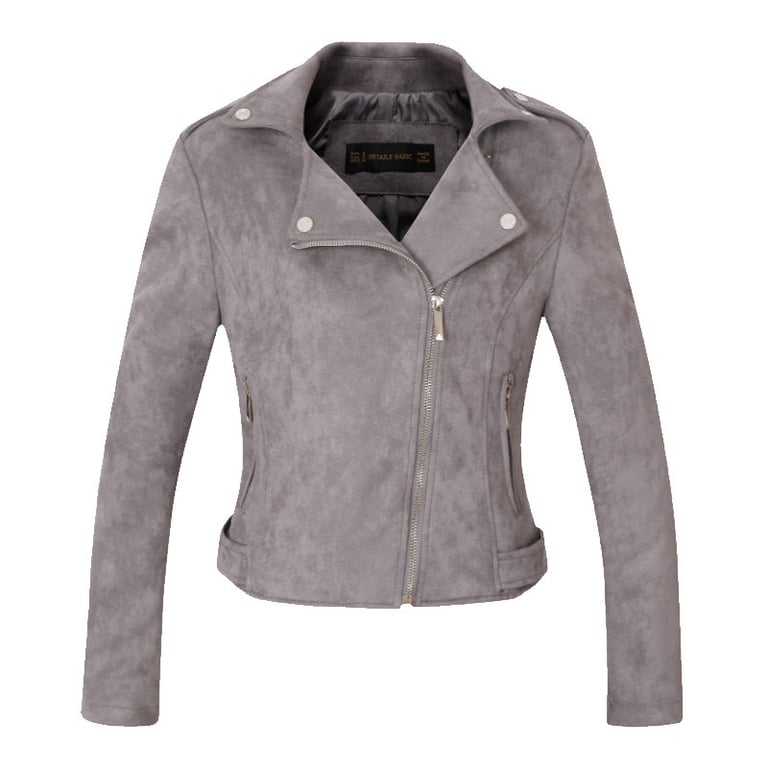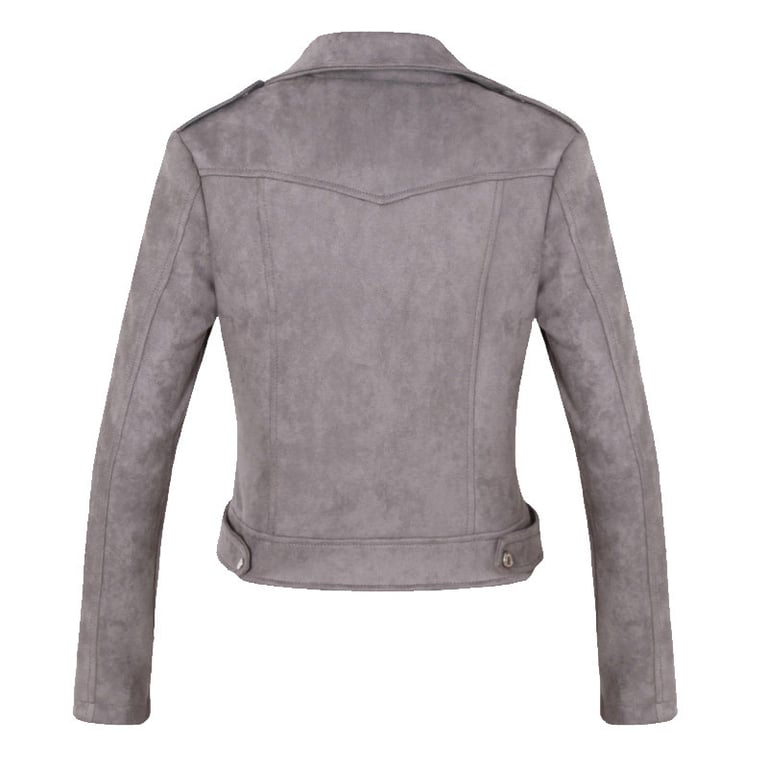 Women's faux leather biker jacket with a suede look. Asymmetrical zip fastening and lapel collar. Two side zip pockets. Available in several colours.
