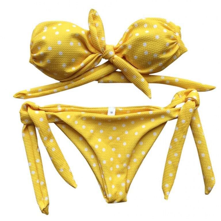 Women's two-piece swimsuit with a polka dot pattern. Ties with a bow. Strapless. Available in multiple colour options.