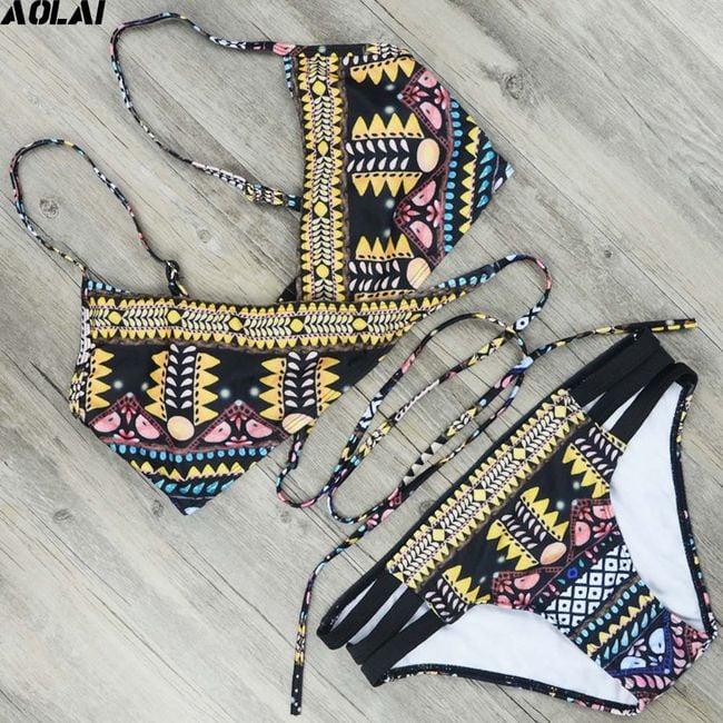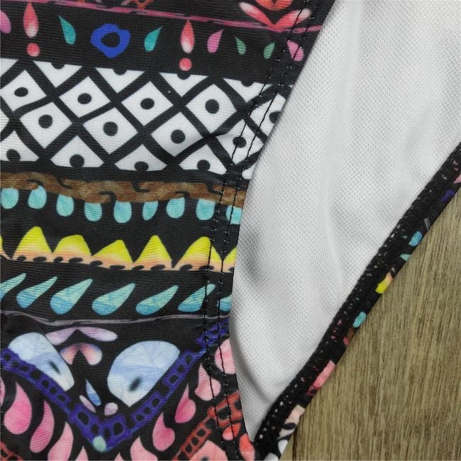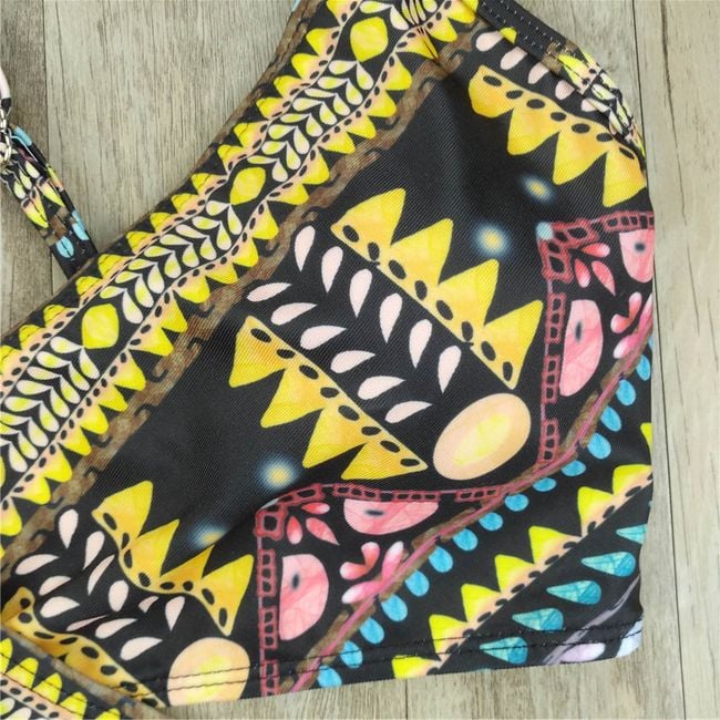 Women's black bikini with colourful patterns serves as a great piece for the beach or pool. The size measurements are provided.