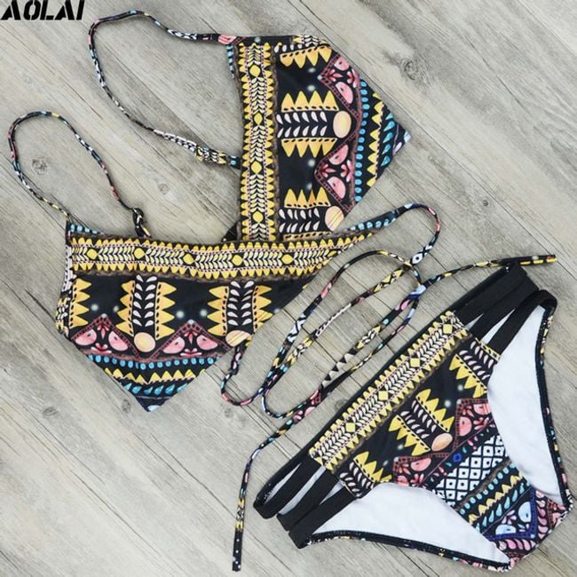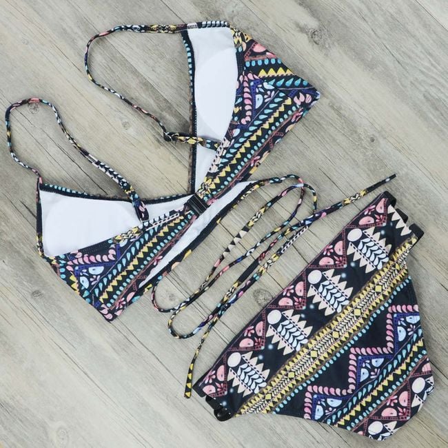 Women's black bikini with colourful patterns