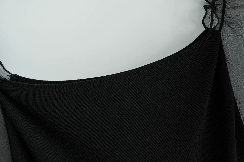 It is short and features fashionable sheer sleeves.