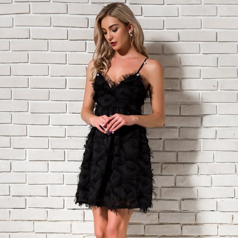 Short women's evening dress with thin straps. The dress features an A-line skirt and a V-neck with embellishments. Ideal for parties, balls, or gatherings.