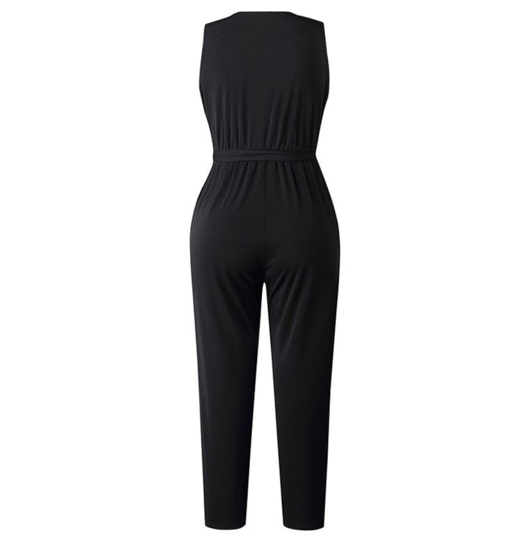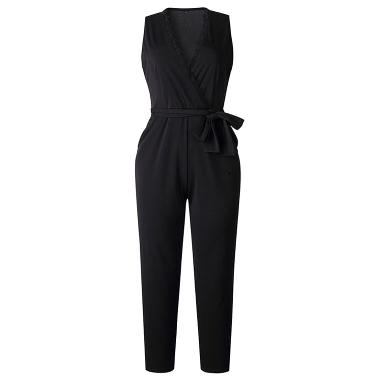 Women's black jumpsuit with a tie at the waist.