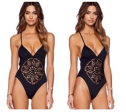 Women's black patterned one-piece swimsuit.